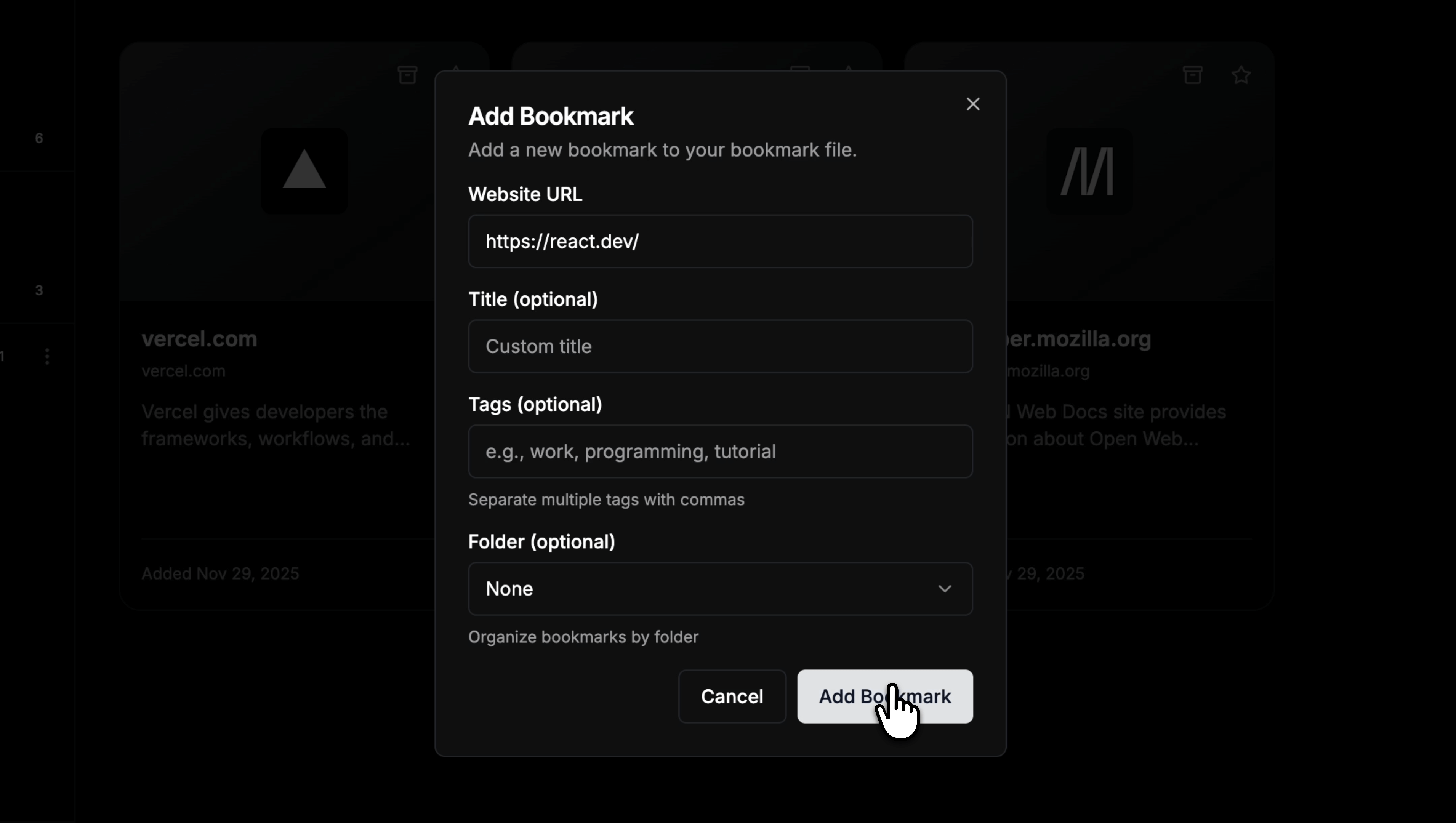 Create folders and tags to organize your bookmarks by topic, project, or any system that works for you.